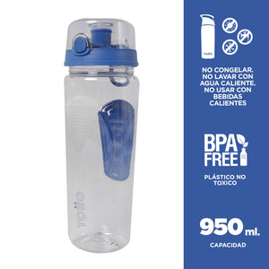¡Tomar agua nos llena de vida! Mantenerte hidratado será muy fácil con este Botellon ergonómico. Está elaborado en plástico, libre de BPA; para no poner en riesgo la salud. Su capacidad es de 95 ml, la tapa viene con sistema de seguridad para evitar filtraciones y con manija para cargar con mayor facilidad. Es ideal para llevar a cualquier lugar, bien sea al gimnasio, oficina, colegio, universidad o zonas deportivas.