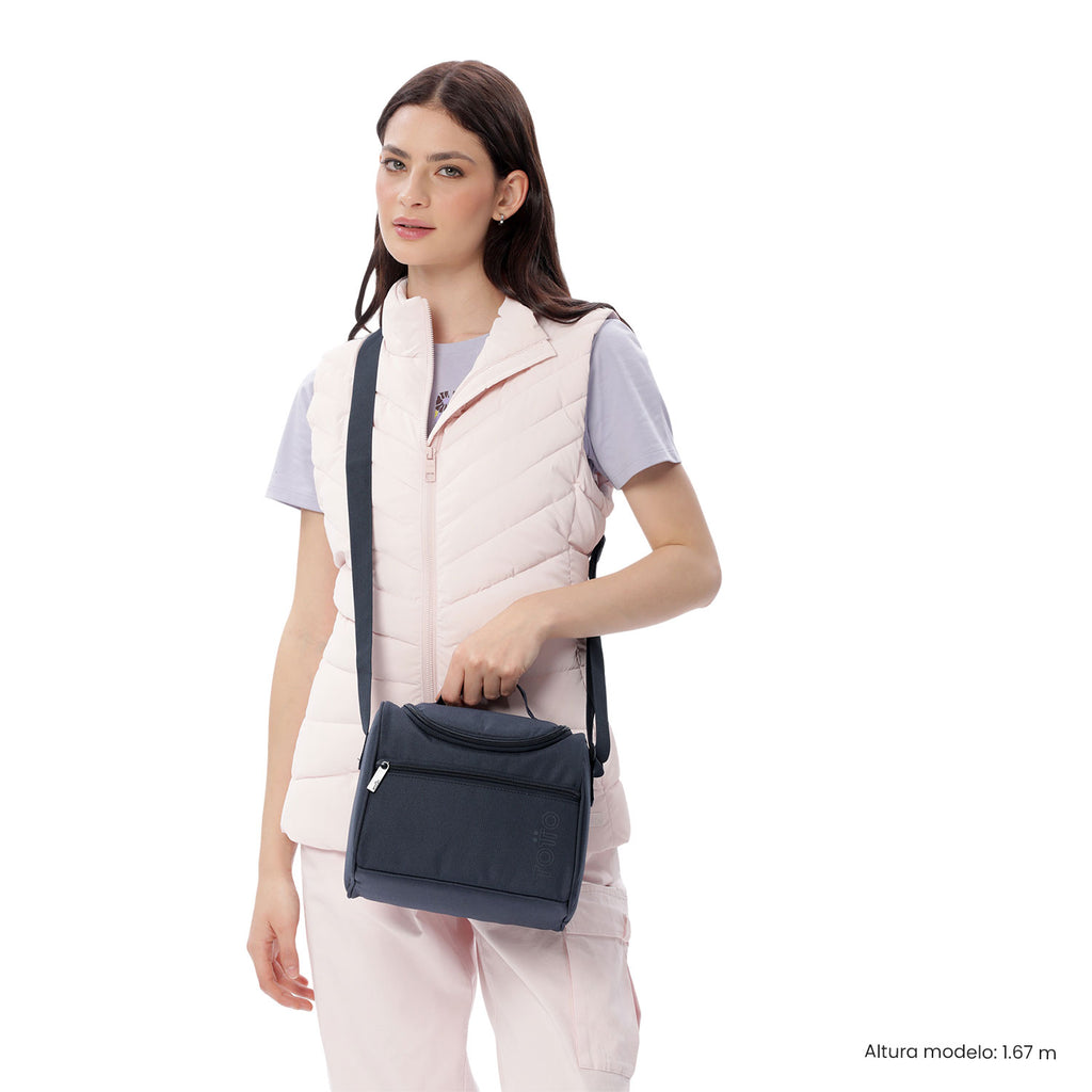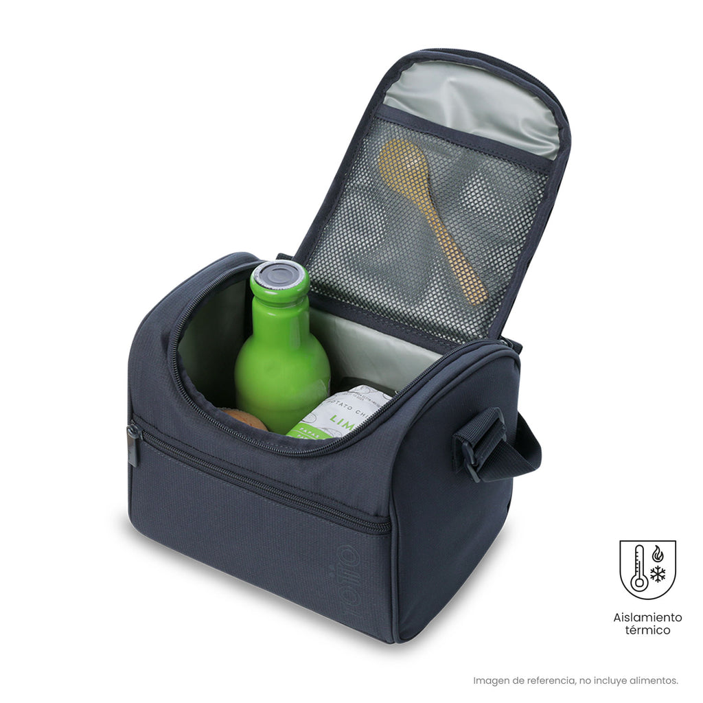 La lonchera mediana Miletto cuenta con tecnología térmica que mantiene la temperatura hasta por 5 horas, es repelente a líquidos y fácil de limpiar. Sus correas ajustables y pasador para sistema de ruedas brindan comodidad, mientras que el bolsillo auxiliar ofrece espacio adicional. Su material es resistente, de secado rápido y no se deforma con el lavado. El logo estampado añade un toque distintivo y único. ¡Llévala contigo!