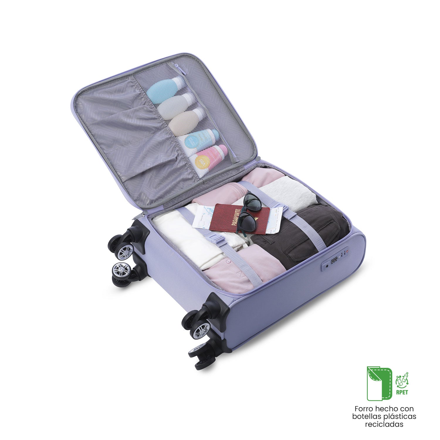 ¡Empieza tu próximo viaje con comodidad! La maleta de 10 kilos pequeña 360 Liviana es perfecta para viajes cortos. Fabricada en poliéster con múltiples bolsillos de acceso rápido, cuenta con doble rueda 360, manija telescópica ajustable y candado TSA para mayor seguridad. Su interior, con forro en material RPET, incluye división con cremallera y bolsillo en malla para mayor organización. ¡Confirma las medidas con tu aerolínea y viaja tranquilo!