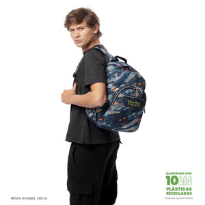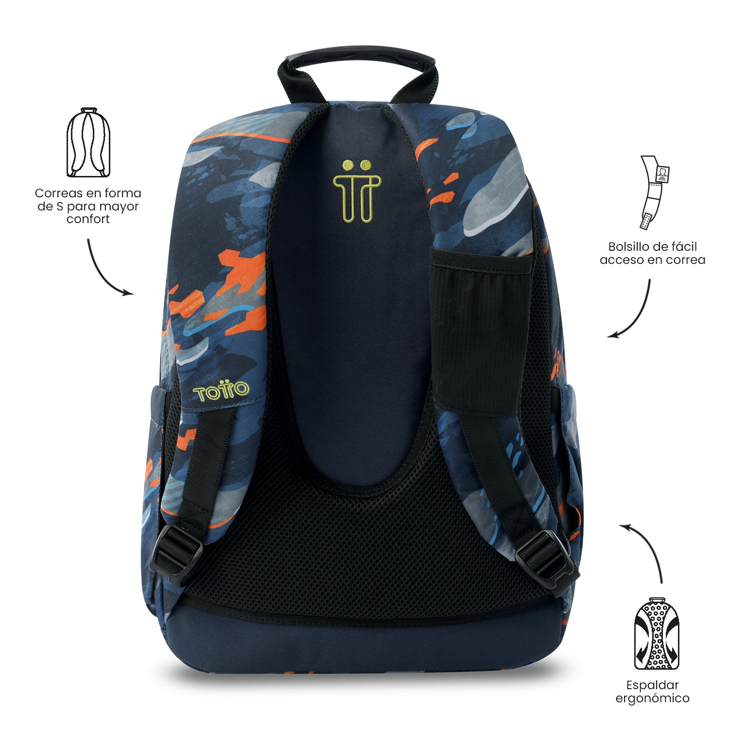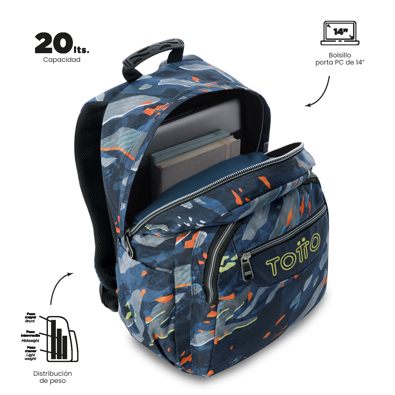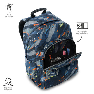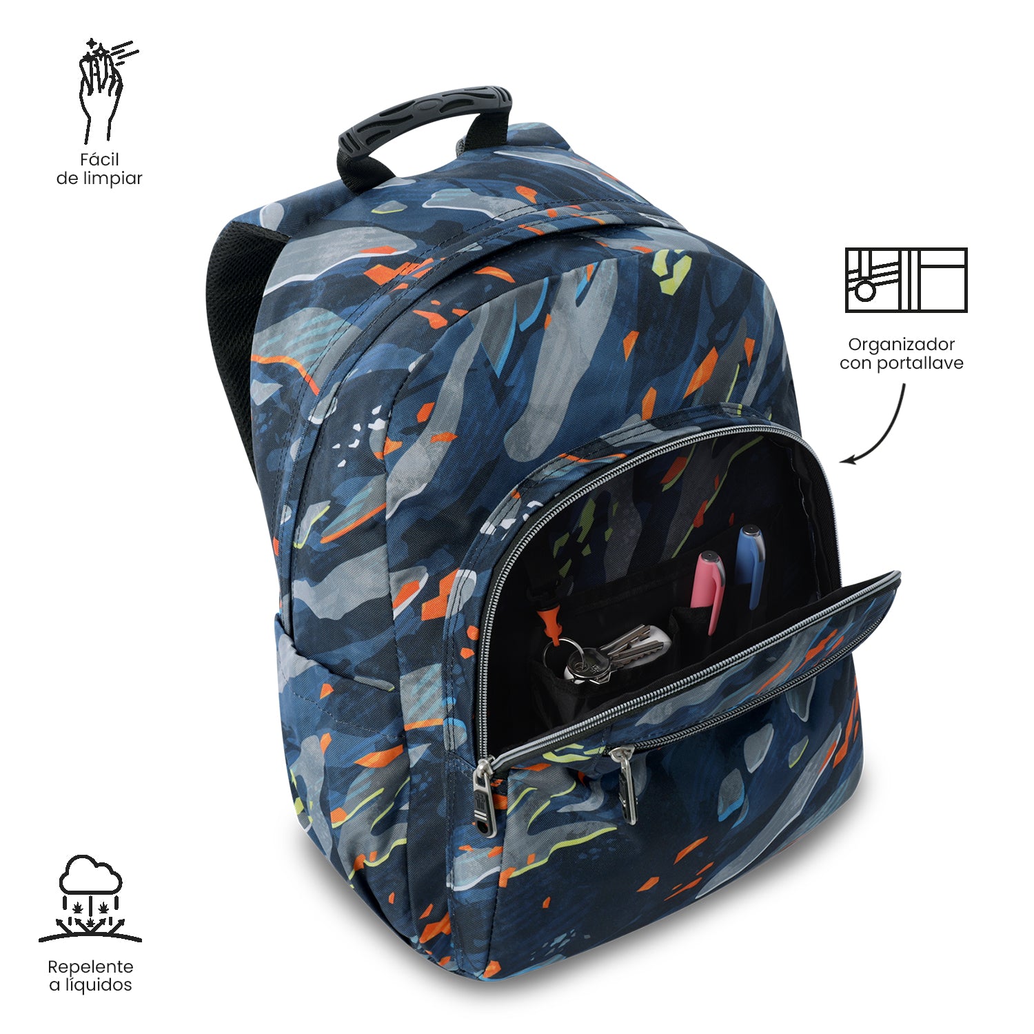 ¡Lleva tus útiles escolares de forma cómoda y segura! La maleta para colegio Acuarela grande y resistente, está elaborada en lona RPET reciclada de 10 botellas. Cuenta con organizador con portallaves, bolsillo para botella, bolsillo en correa para carnet o tarjeta, y bolsillos frontales de acceso rápido. Su capacidad de 20 L, espaldar y correas ergonómicas con air mesh ofrecen confort durante el día. ¡Cómprala ahora y organiza tu día!