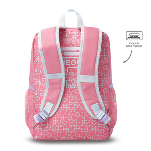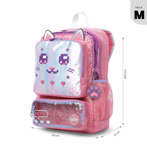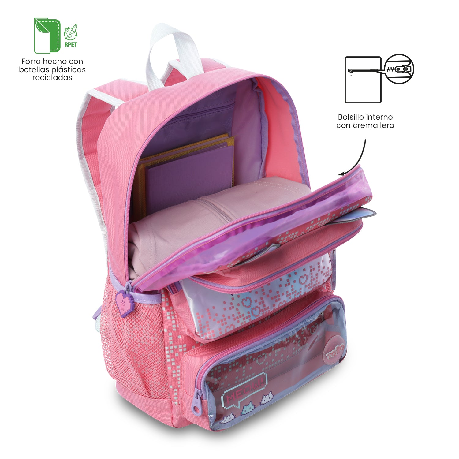 ¡Haz que cada trayecto escolar sea inolvidable! La mochila para niña Andy Cat grande tiene compartimiento principal con doble cremallera, dos bolsillos frontales con cierre, bolsillos laterales porta botellas, manija superior y correas acolchadas ajustables. Confeccionada en poliéster y forrada en RPET reciclado, incluye llavero interactivo en goma en forma de garra y parches intercambiables. ¡Diversión para cada día en el colegio!