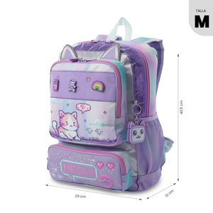 ¡Expresa su personalidad con detalles únicos! La mochila para niña Andy Cat mediana tiene compartimiento principal con doble cremallera, dos bolsillos frontales con cierre, bolsillos porta botellas, manija superior y correas acolchadas ajustables. Su interior en RPET apoya el planeta. Incluye divertido llavero en goma en forma de garra y parches intercambiables que le dan un toque especial. ¡Complementa sus días con una mochila para colegio!