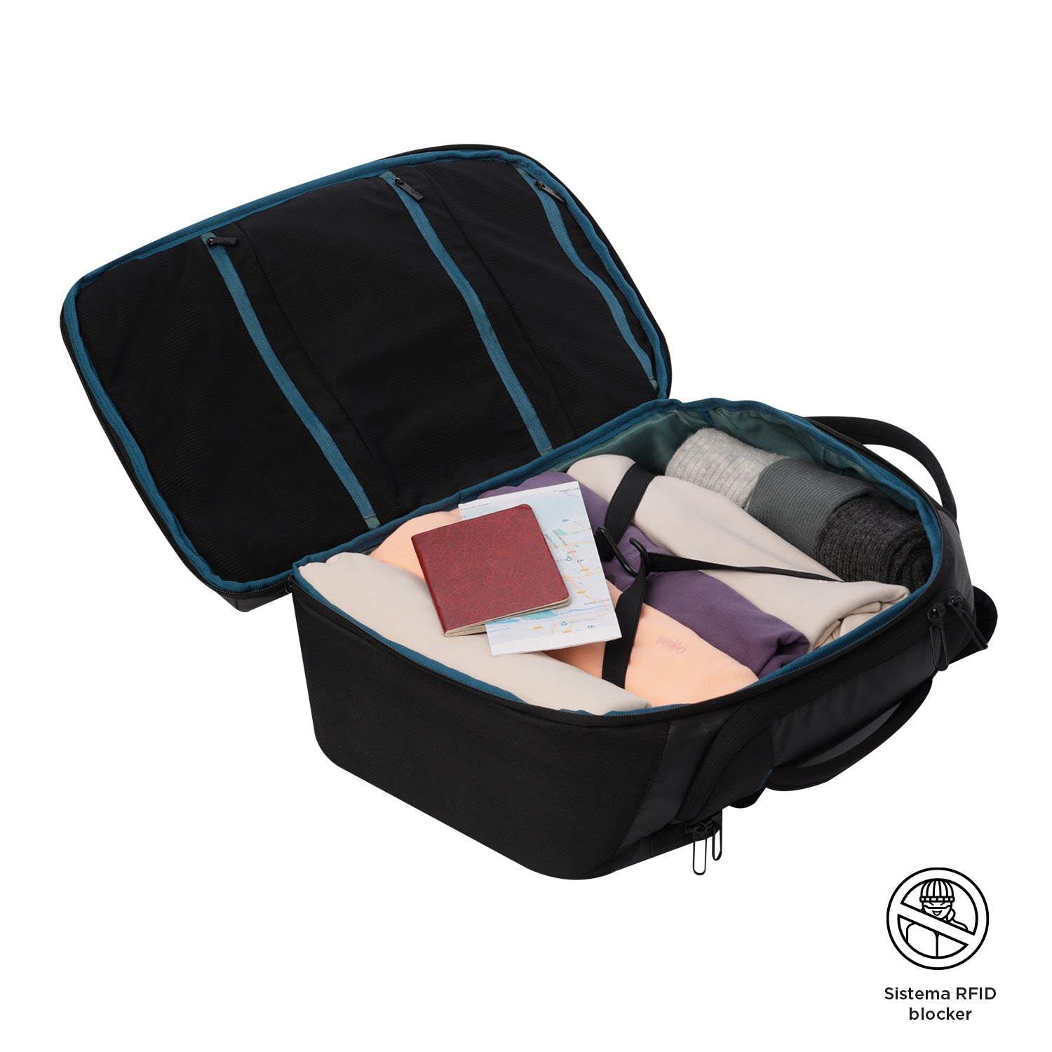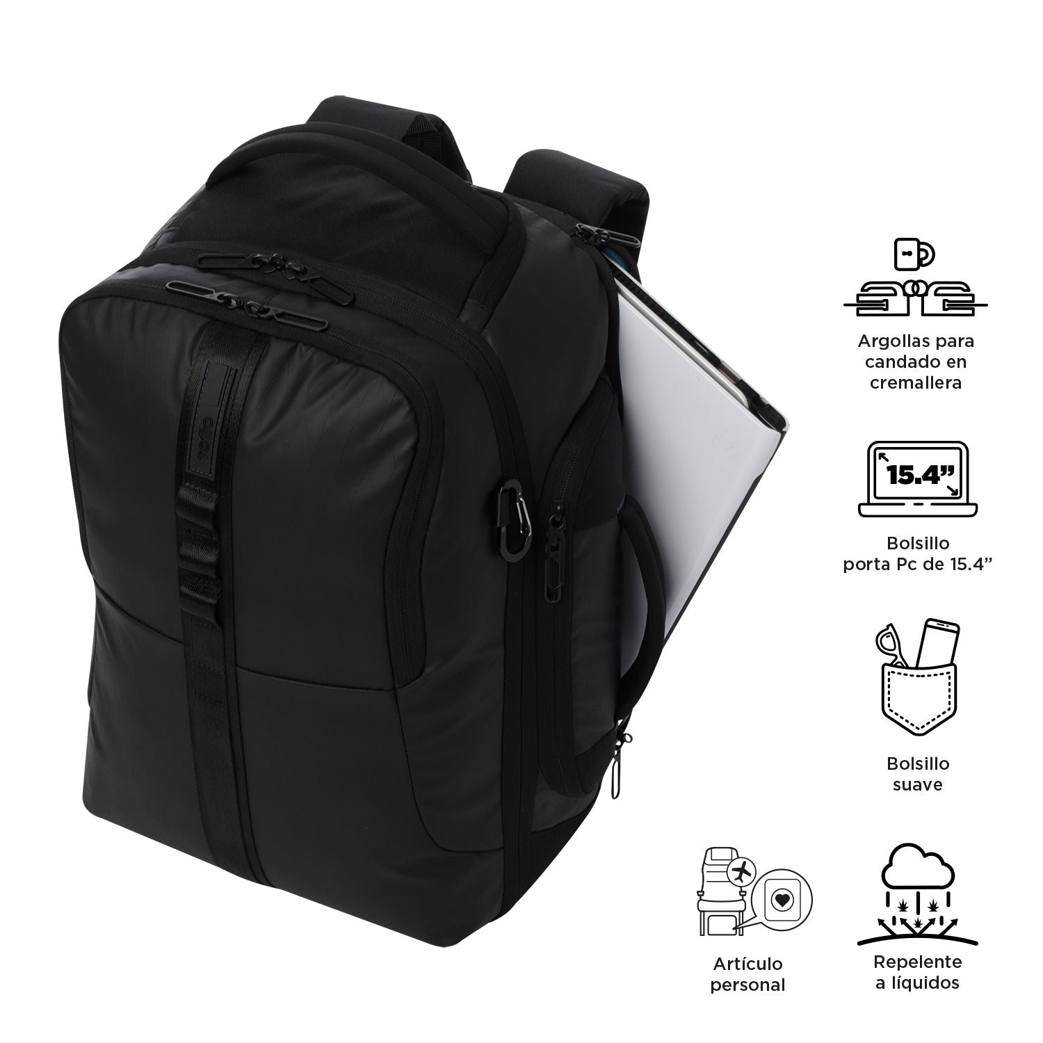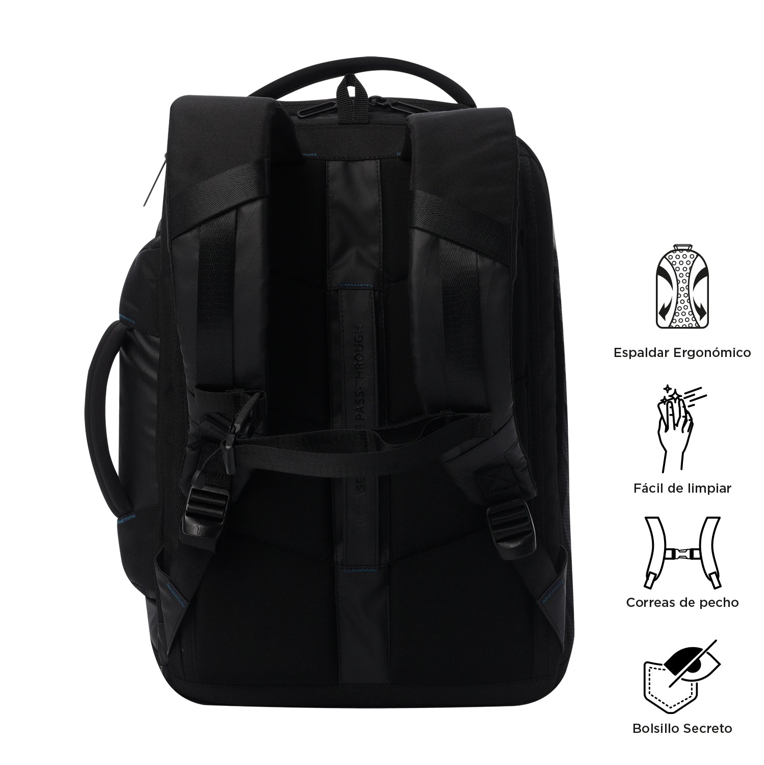 ¡Viaja cómodo y organizado! El morral Deploy Travel incluye un compartimiento tipo maleta con organizadores de elástico y malla. Integra dos bolsillos laterales: uno con clip portallaves y otro en malla para botellas. En la parte superior, un bolsillo porta tecnología protege tus dispositivos. Además, cuenta con compartimiento exclusivo para tu portátil y pasador para manijas telescópicas. ¡Haz de cada viaje una experiencia increíble!