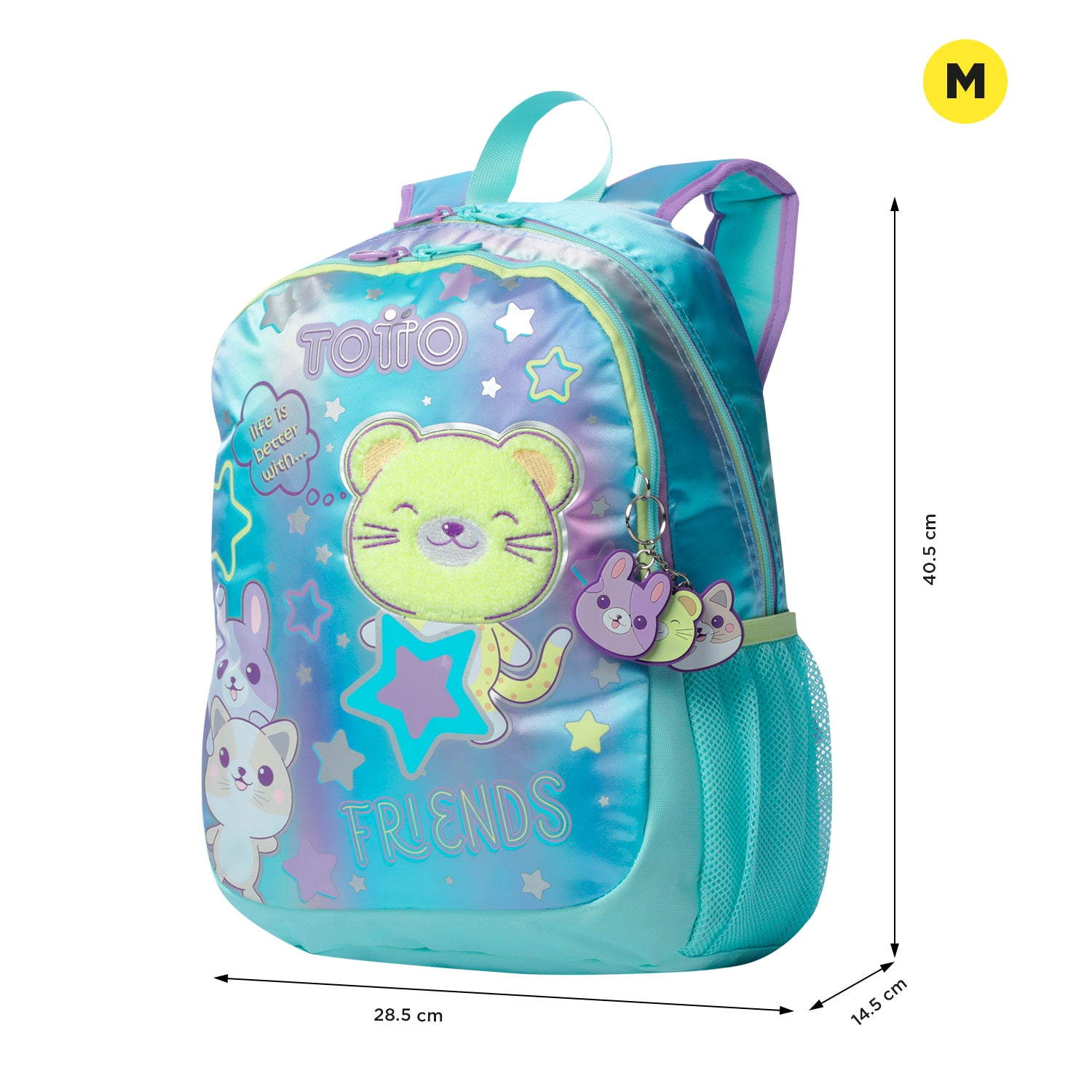 ¡Haz que cada día de colegio sea especial con la mochila Friends M! Confeccionada en poliéster, presenta un estampado en puff y escarcha en la parte frontal. Cuenta con un compartimiento principal con cierre en doble cremallera, correas acolchadas ajustables, manija superior en reata y bolsillos con cierre en cremallera. Además, su bolsillo frontal con cierre es ideal para objetos pequeños y trae un encantador llavero tipo pom pom.
