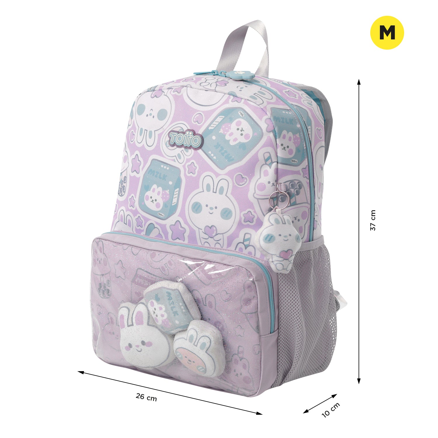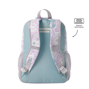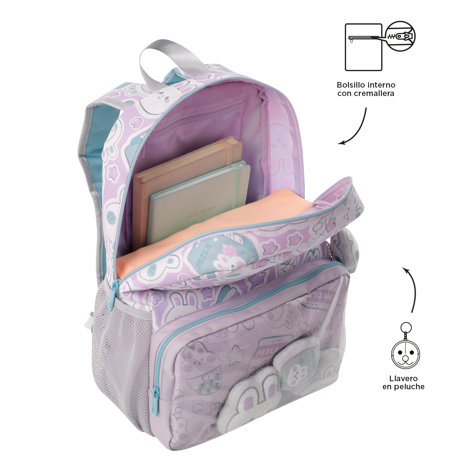 ¡Dale un toque especial a sus días escolares con el morral Kawi! Confeccionado en poliéster, tiene un estampado brillante con escarcha e un bolsillo frontal transparente para pequeños peluches. Incluye un compartimiento principal con doble cremallera, bolsillos laterales porta botellas e un bolsillo frontal con organizador. Sus correas acolchadas e la manija superior brindan comodidad. ¡Incluye un divertido llavero en goma en forma de conejo!