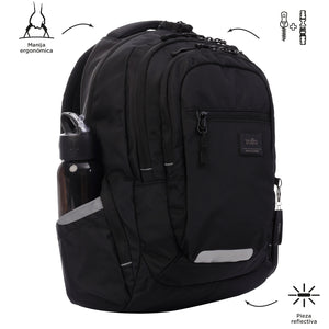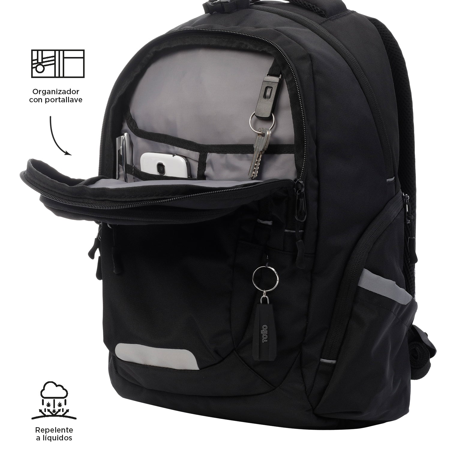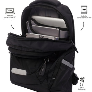 ¡Todo lo que buscabas en un solo morral, espacioso, cómodo y amigable con el planeta! Cuenta con un compartimento principal con cierre en cremallera y una hebilla de seguridad, es porta PC de 13”, porta tablet de 10”, tiene bolsillo frontal con múltiples organizadores, llavero extraíble y bolsillos laterales. Además, tiene espaldar acolchado para mantener la comodidad en tu espalda, correas ajustables, bolsillo secreto y apliques reflectivos.