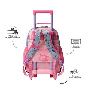 ¡Haz que el colegio sea divertido con la mochila con ruedas para niñas Minnie! Fabricada en poliéster, presenta un estampado en alta densidad y un moño interactivo en la parte frontal. Cuenta con un compartimiento principal con doble cremallera, correas ajustables, manija superior en reata y bolsillos laterales porta botellas, bolsillo frontal con cierre es perfecto para objetos pequeños y el llavero de goma añade un toque único.