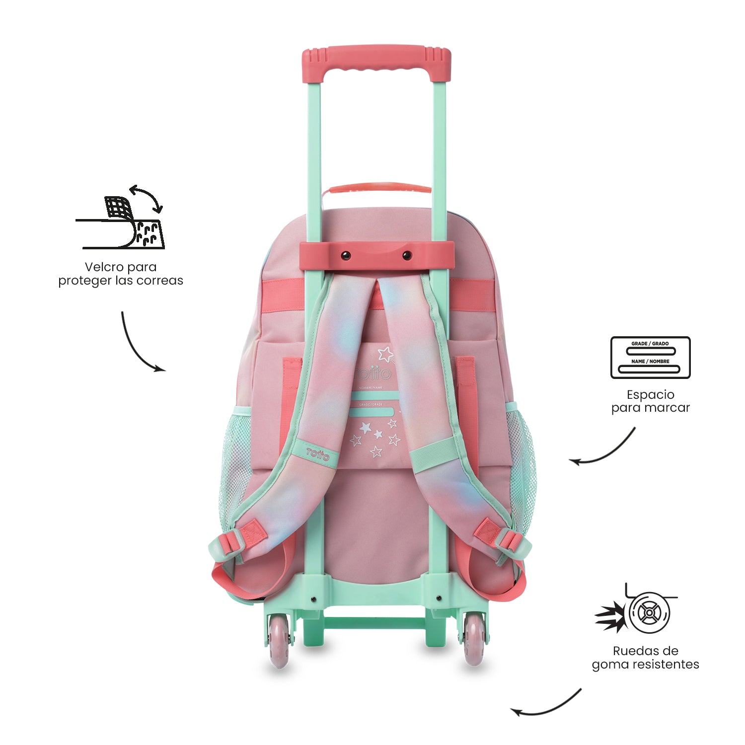 ¡Llévala donde la imaginación brille! La maleta para niña con ruedas Rainbow Star grande tiene un frente decorado con lentejuelas reversibles y estampado de estrellas, bolsillo frontal espacioso, doble cremallera, correas acolchadas ajustables, manija superior y bolsillos laterales para botellas. El llavero en goma con forma de nube y arcoíris completa su encanto. ¡Ideal para todas sus clases!