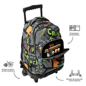 ¡Brinda comodidad y protección a tu pequeño! El morral con ruedas para niño, modelo Bomper Renglones con protección contra impactos, cuenta con un compartimiento porta PC de 15.4". Fabricado con lona RPET de 13 botellas recicladas, incluye un organizador con portallaves, bolsillo para botella, ruedas de goma de alta resistencia, manija telescópica y protectores para evitar ensuciar la ropa. ¡Adquiérelo hoy mismo y facilita sus días escolares!
