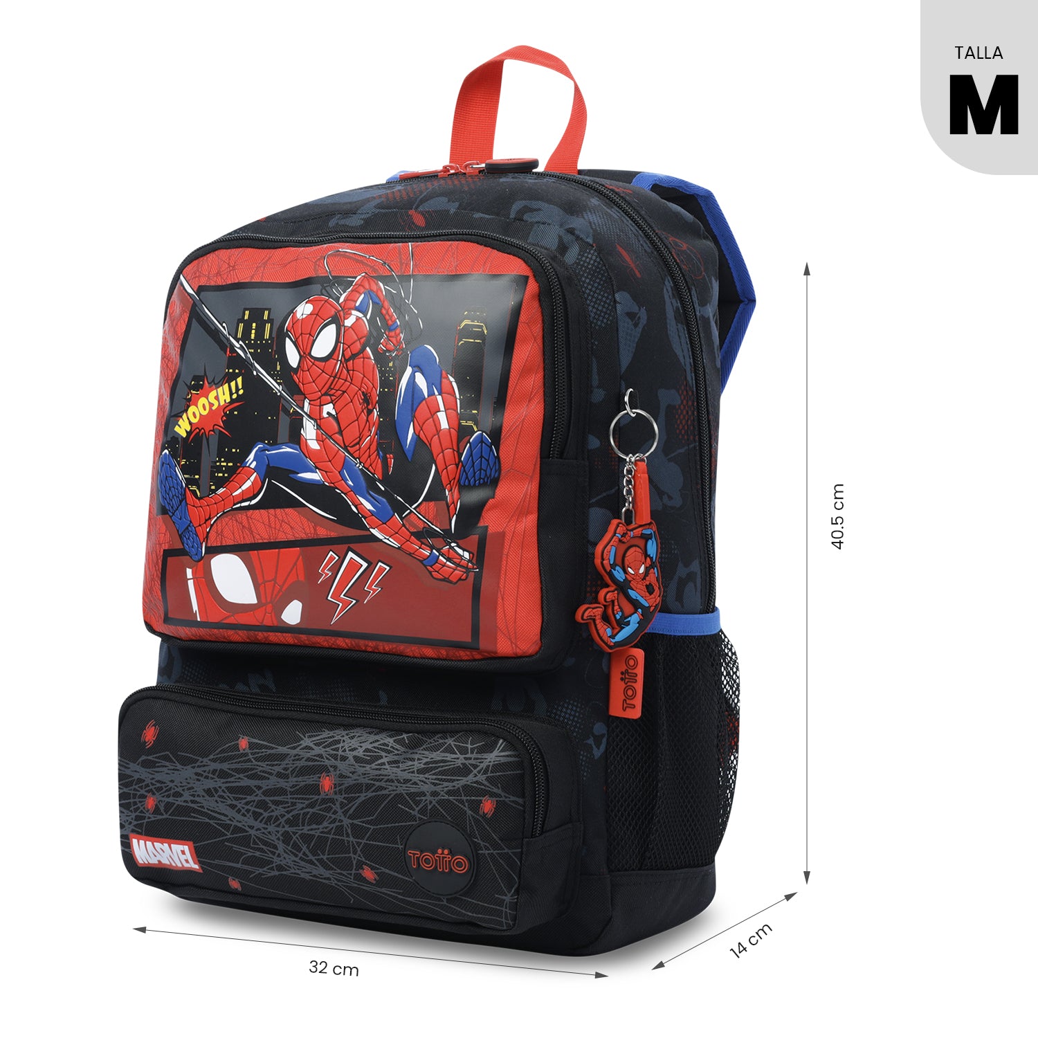 ¡Que cada día sea una nueva misión de superhéroe! El morral para niño Spiderman Hero en tamaño mediano resalta con un estampado en alta densidad inspirado en Marvel, amplio compartimiento de doble cremallera, organizador interno, bolsillos laterales para botellas y correas acolchadas. Incluye un divertido llavero de Spiderman en goma y forro RPET hecho con botellas recicladas. ¡Convierte esta maleta para el colegio en su aliada diaria!