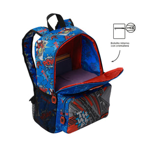 El morral Spiderman Pop grande es ideal para el colegio, combinando espacio, comodidad e diseño. Cuenta con un bolsillo principal amplio con cierre de doble cremallera, bolsillos laterales porta botellas e un bolsillo frontal funcional. Sus correas acolchadas ofrecen confort al llevarlo, mientras la manija superior en reata facilita su uso. Además, incluye un llavero de Spiderman en goma que le da un toque especial. ¡Perfecto para acompañar sus días!