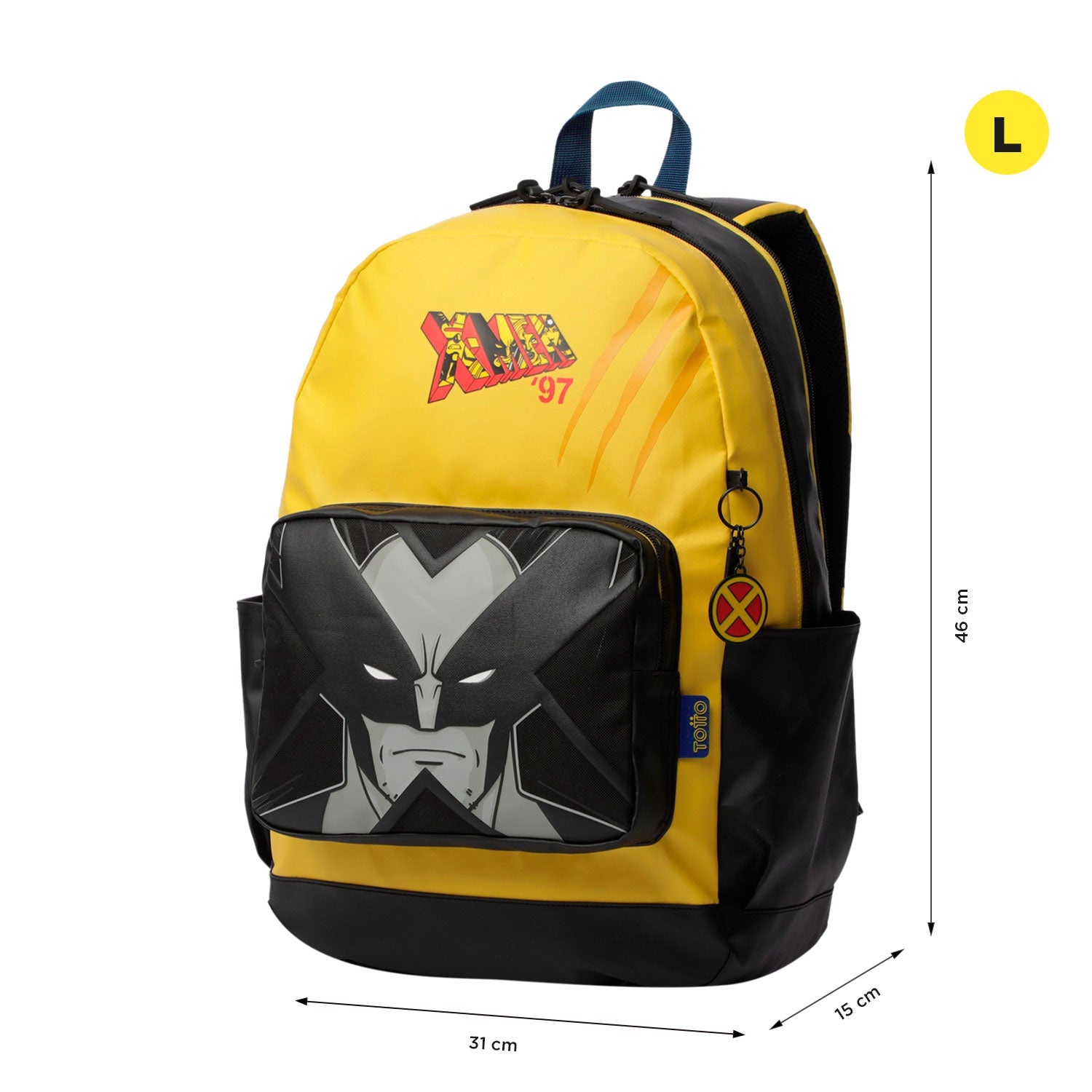 ¡Durabilidad e diseño en un solo morral! La maleta para el colegio X-Men Wolverine está confeccionada en poliéster resistente, con un estampado que aporta un toque único. Su compartimiento principal con doble cremallera incluye un porta PC de 14", además de bolsillos laterales porta botellas e un bolsillo frontal con cierre. Sus correas acolchadas ajustables e manija superior ofrecen comodidad. ¡Incluye un llamativo llavero interactivo de goma!